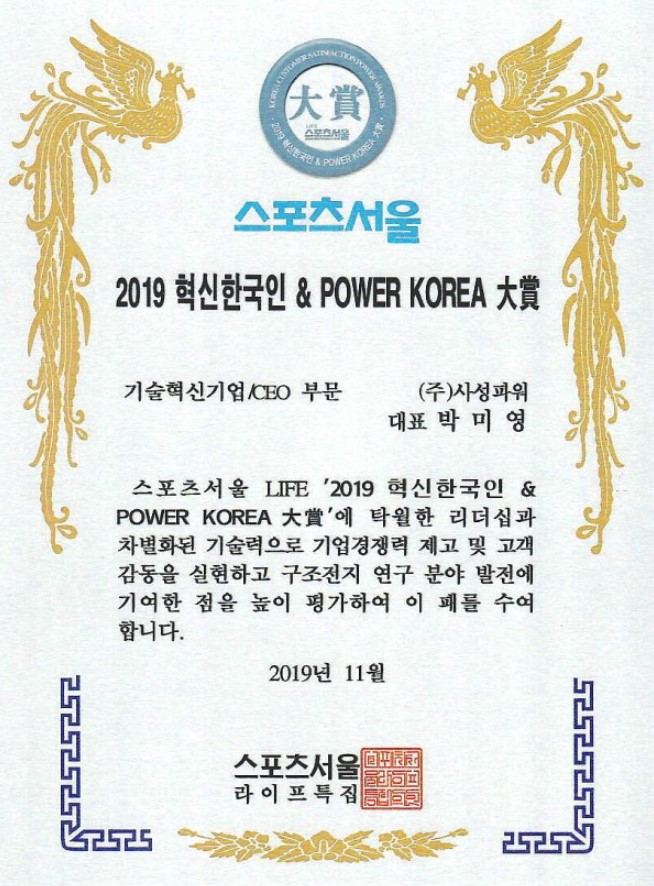 Sports Seoul LIFE ‘2019 Innovative Korean & POWER KOREA Grand Prize’In recognition of outstanding leadership and differentiated technology that enhanced corporate competitiveness and achieved customer satisfaction, as well as significant contributions to the advancement of structural battery research, this award is hereby presented.